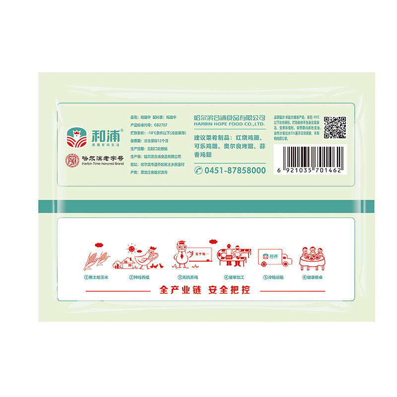 無抗雞翅中 產(chǎn)品規(guī)格:500克 包裝方式:袋裝 保存狀態(tài):-18℃條件下冷凍保存 生產(chǎn)許可證號(hào):SC11123010400133 生產(chǎn)單位: 哈爾濱合浦食品有限公司